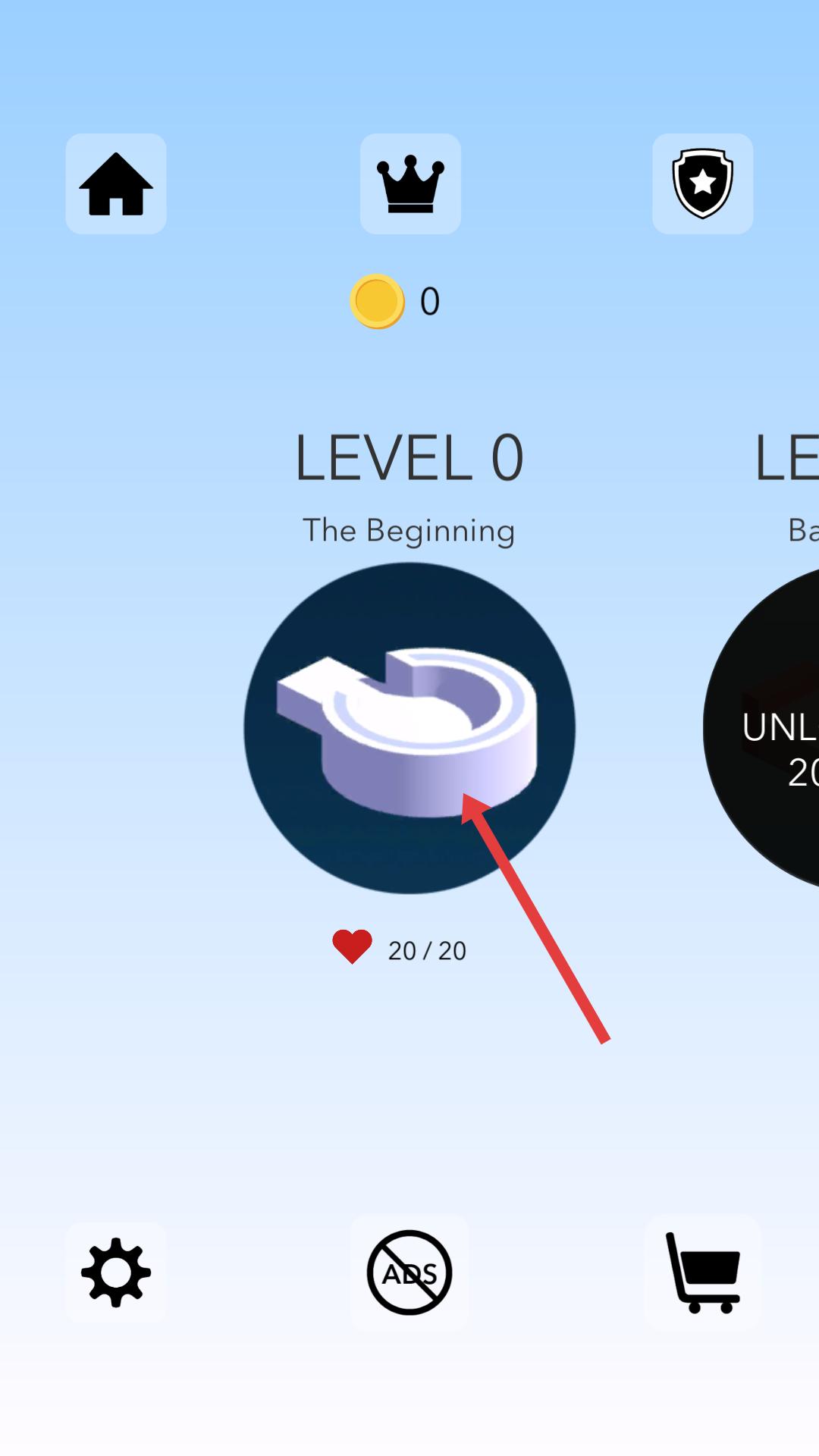 1、游戲初始界面顯示關卡0開始,點擊中間帶有特殊形狀的圖標,進入游戲第一關場景,準備開始挑戰。