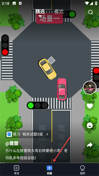 4、刷題頁,以場景動畫形式講解駕考知識,關聯相關試題,支持互動交流,底部刷題是趣味學習功能入口。