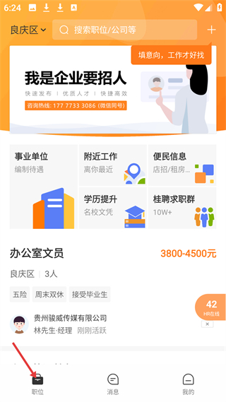 1、職位頁,定位良慶區,含企業招聘入口及多類功能模塊,展示辦公室文員崗位信息,是求職信息的核心展示平臺。