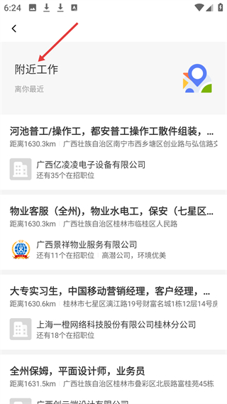 2、附近工作頁,呈現周邊崗位,標注職位距離與公司信息,適配求職者查找就近工作的實際需求。