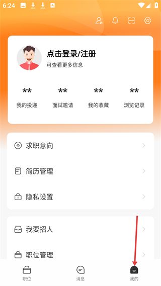 4、我的頁,需登錄后查看投遞等信息,含求職意向、簡歷管理等功能,是個人求職事務的管理中心。