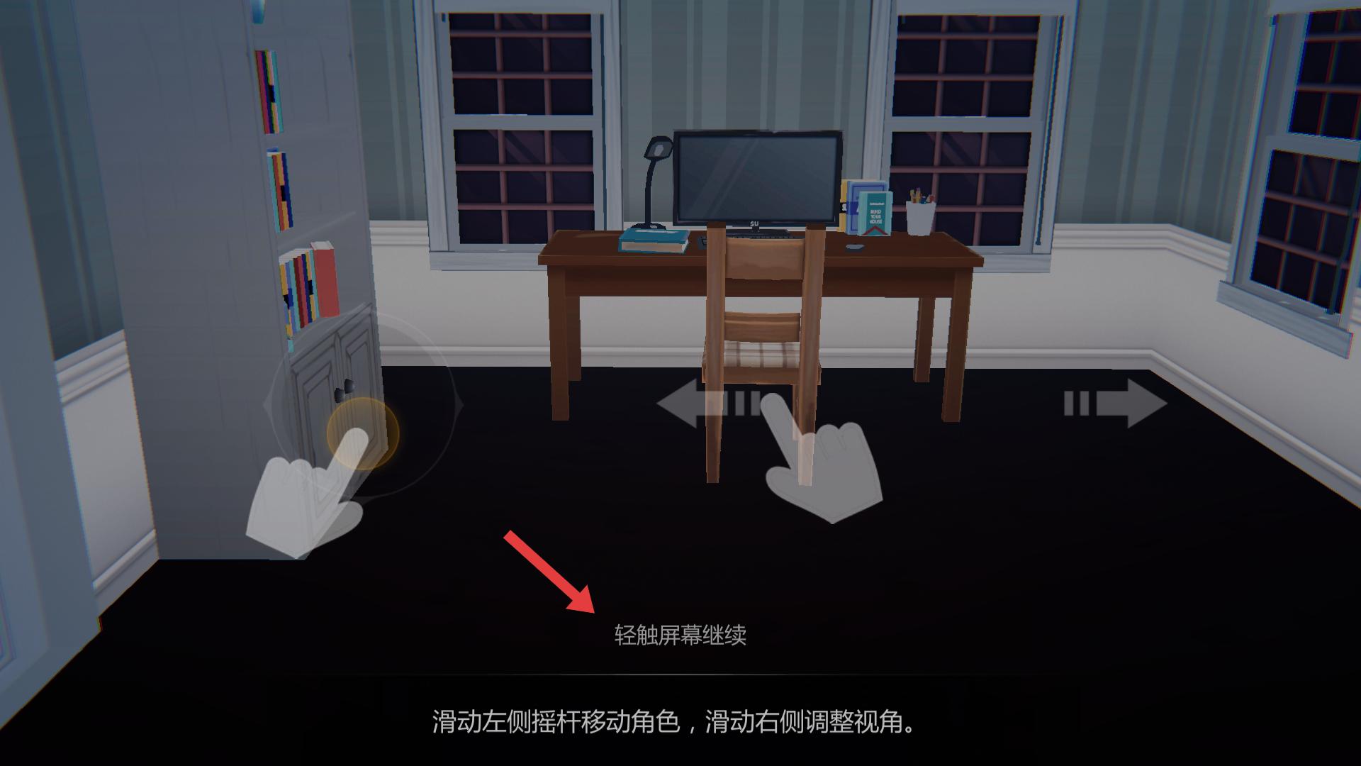 2、到書房后,輕觸屏幕繼續,滑動左側搖桿移動角色,右側調整視角,探索房間,留意交互提示。
