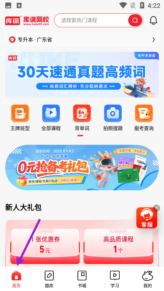 1、首頁頂部有搜索欄,展示專升本課程活動,如30天速通真題高頻詞還有新人大禮包和客服入口。