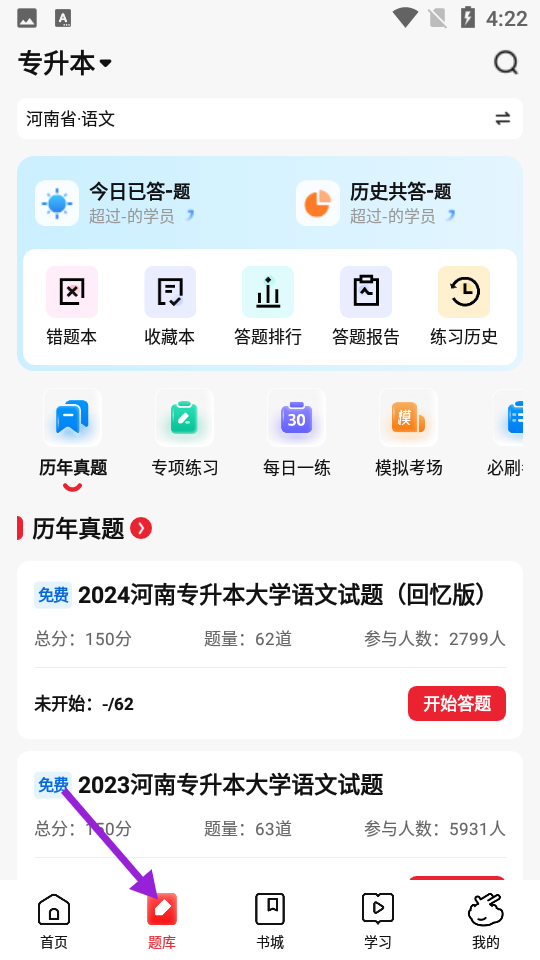 2、題庫頁面可選擇省份和學科,有歷年真題、專項練習等板塊,顯示真題試卷的總分題量及參與人數。