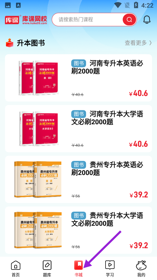 3、書城界面呈現專升本圖書,像河南、貴州等地的英語和大學語文必刷2000題標明價格可查看更多圖書。