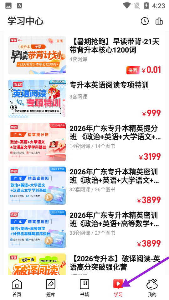 4、學習中心頁面羅列各類專升本課程,如英語早讀帶背、閱讀專項特訓等,部分課程支持拼團標注價格和內容。