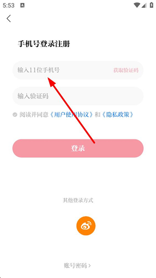 3、進入手機號登錄注冊界面,設有11位手機號、驗證碼輸入框,搭配獲取驗證碼按鈕,支持其他登錄方式,需勾選協議后完成登錄。