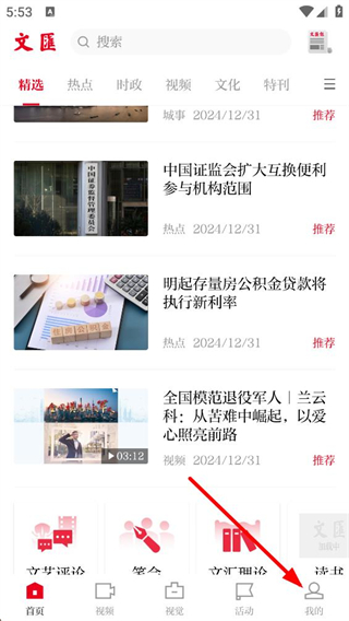 1、進入界面可見文匯標識,含精選、熱點等資訊板塊,展示證監會政策、公積金利率等內容,底部設首頁、視頻等功能按鈕,可點擊我的進入對應板塊。