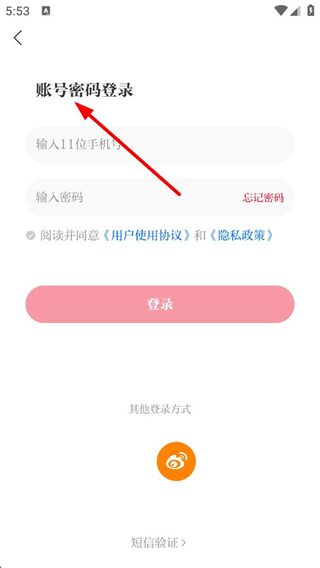 4、進入賬號密碼登錄界面,包含手機號、密碼輸入框,設有忘記密碼選項,支持其他登錄方式,勾選協議后可完成登錄流程。
