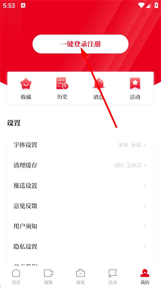 2、進入我的界面看到一鍵登錄注冊按鈕,搭配收藏、歷史等功能選項,還有字體設置、清理緩存等設置項,可點擊登錄按鈕推進操作。