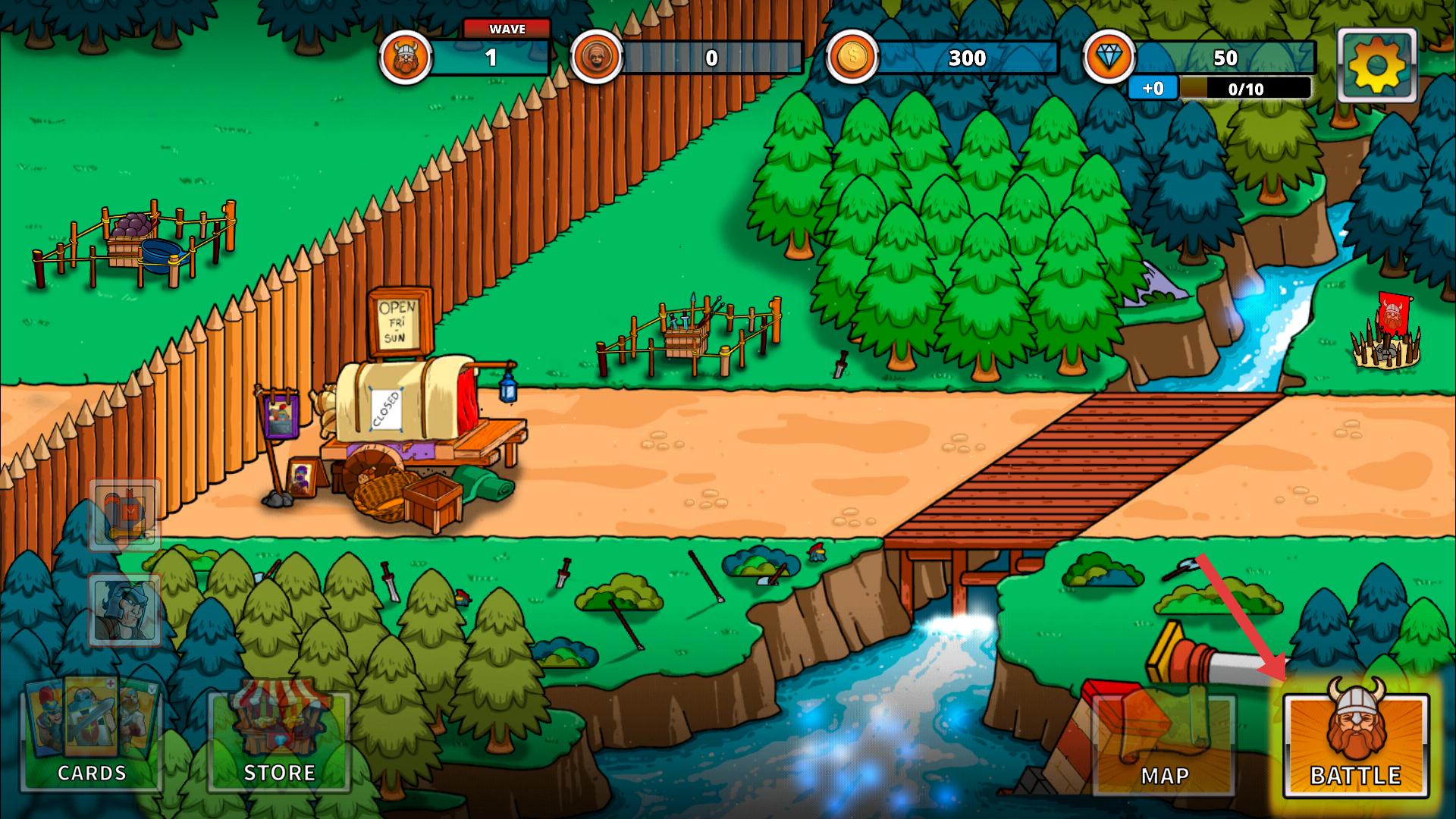 1、點擊BATTLE,進入戰斗準備,利用金幣鉆石,在商店升級卡牌,提升戰力,迎接魔物進攻。