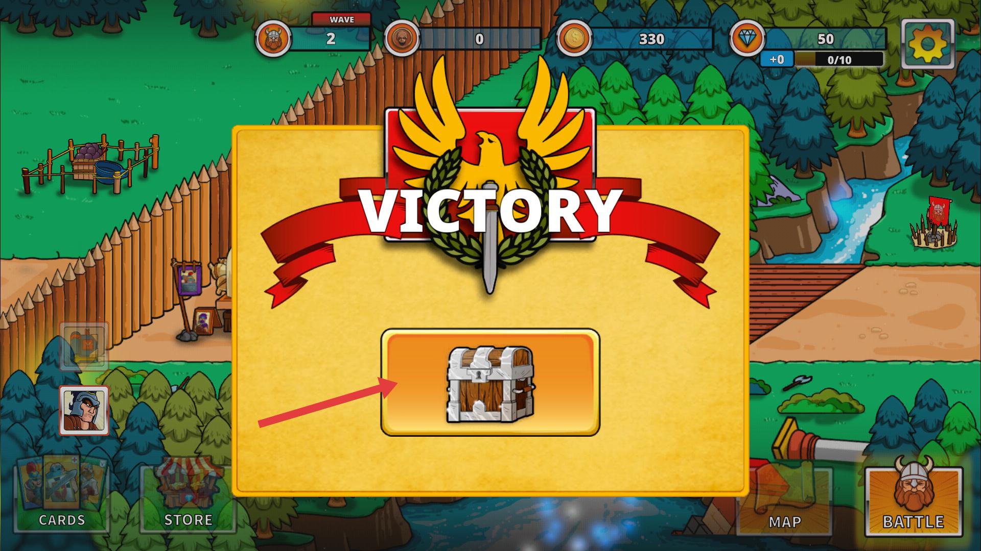 3、勝利后點擊寶箱,獲取獎勵,用于強化英雄、解鎖新卡牌,提升實力,應對后續關卡。