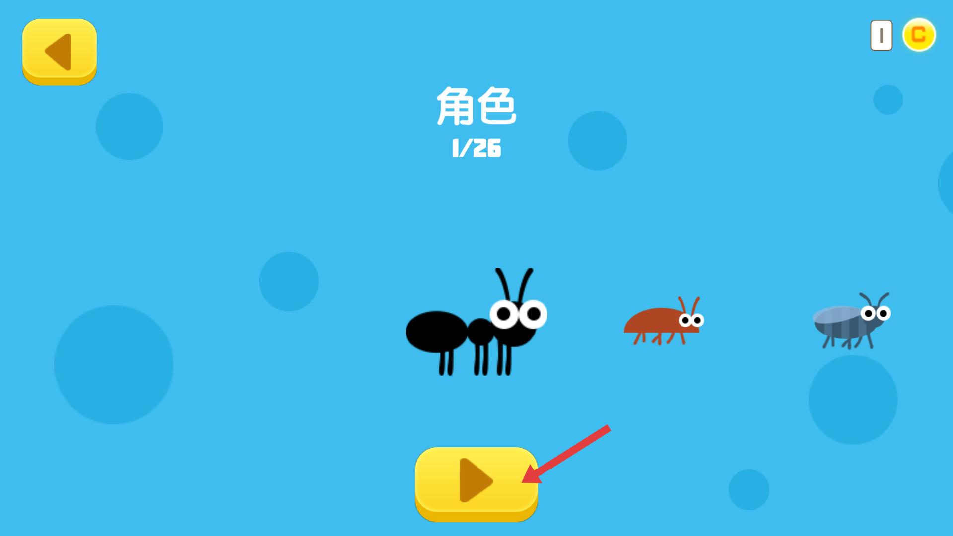 2、角色選擇界面有多種蟲子角色,當前可選擇黑螞蟻,點擊下方播放按鈕,確定角色并進入游戲。
