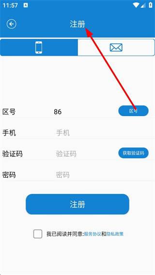 3、切換至注冊界面手機方式,顯示區號、手機、驗證碼等輸入項,勾選相關協議后,可填寫信息并點擊注冊按鈕完成注冊。