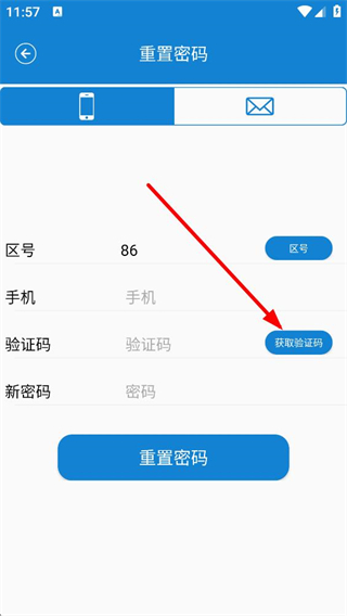 2、進入重置密碼界面,選擇手機驗證方式,看到手機、驗證碼、新密碼輸入框,點擊獲取驗證碼按鈕,準備填寫信息重置密碼。
