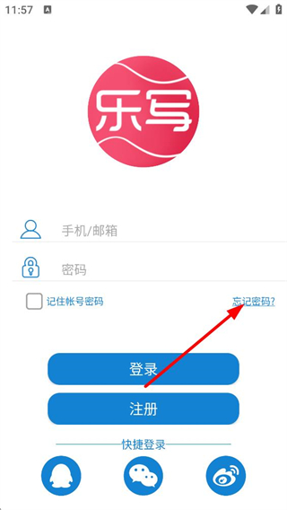 1、進入樂寫登錄界面,可見手機、郵箱及密碼輸入區域,還有記住賬號密碼選項,點擊忘記密碼,進入重置密碼的操作界面。