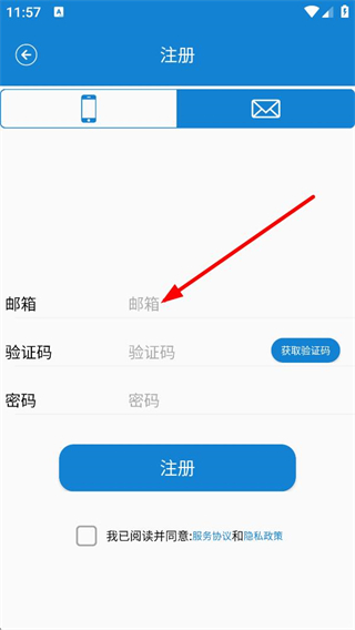 4、切換到注冊的郵箱方式界面,呈現郵箱、驗證碼、密碼輸入區域,后續可填寫郵箱相關信息,推進賬號注冊的流程。
