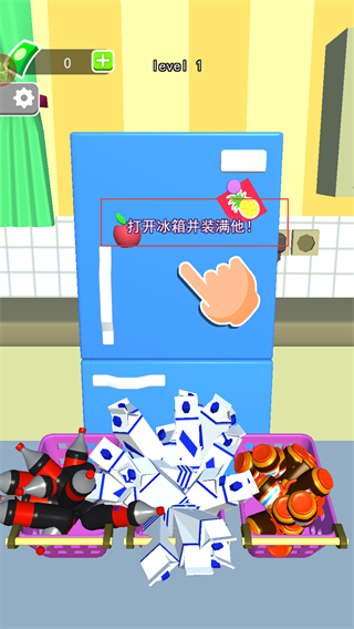 1、在游戲界面中查看關卡提示,點擊冰箱區域打開冰箱門,開始準備填充物品,進入關卡操作環節。