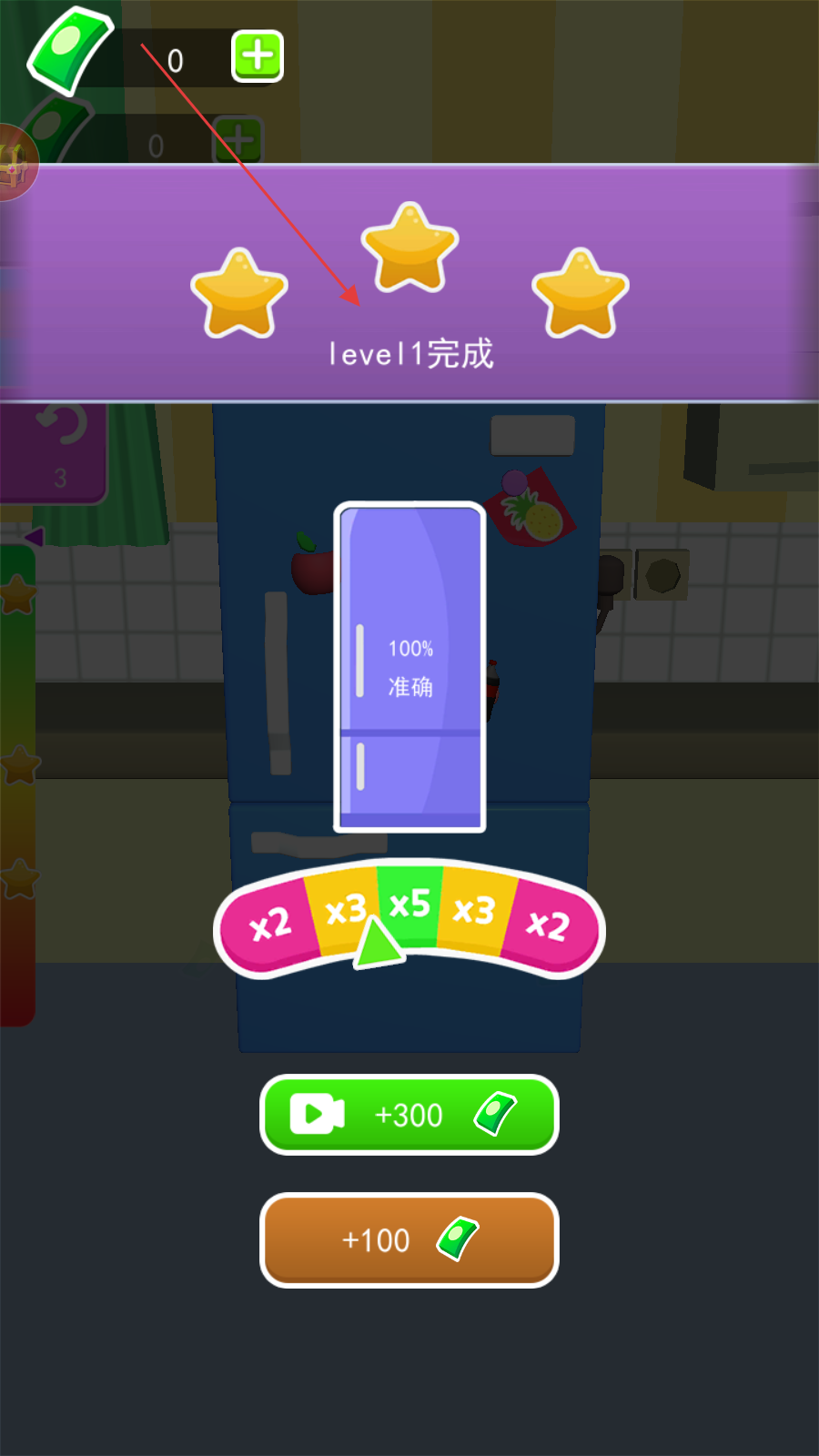 4、成功填滿冰箱并關閉冰箱門后,系統會根據裝填的效果給予星級評價及金錢獎勵,即可點擊進入下一關。