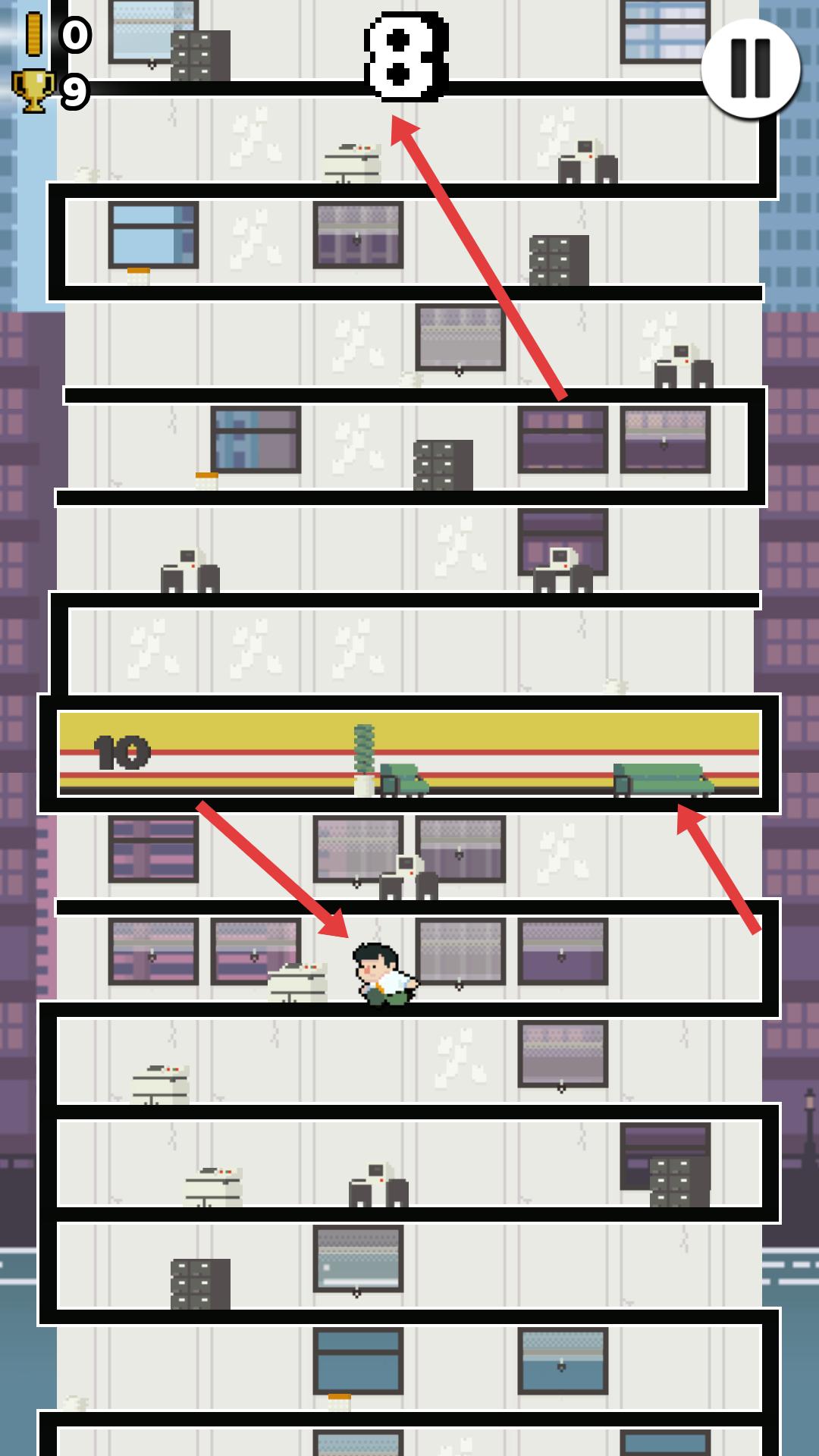 3、進入攀爬環節,控制角色在樓層間移動,躲避障礙物,向上攀爬,爭取獲得更高分數和獎杯數。