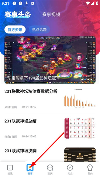 1、進入賽事界面,可查看賽事頭條和賽事視頻,官方資訊和熱點話題中了解如武神壇冠軍、賽事數據分析等內容,掌握游戲賽事動態。