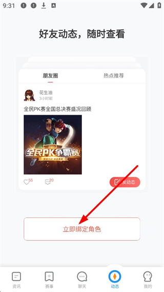 2、動態界面,能查看好友朋友圈和熱點推薦的動態,還可點擊立即綁定角色,方便同步游戲角色信息,隨時了解好友游戲動態。