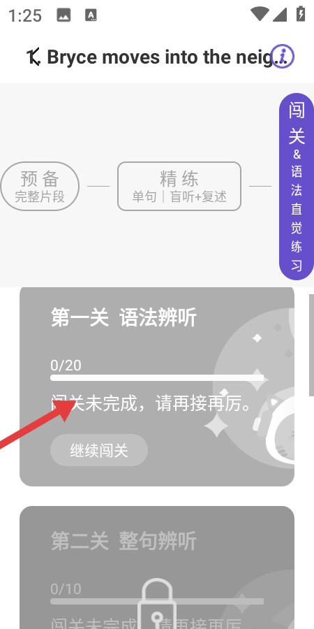 3、闖關學習界面直觀語法辨聽等關卡設置,進度條與闖關未完成提示,搭配繼續闖關按鈕,激勵用戶攻克英語語法聽力難題。