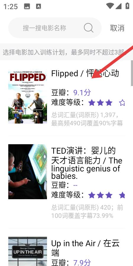 2、電影選擇頁信息詳實怦然心動等影片展示,豆瓣評分、難度等級與詞匯量標注,方便用戶篩選適配電影,開啟場景英語訓練之旅。