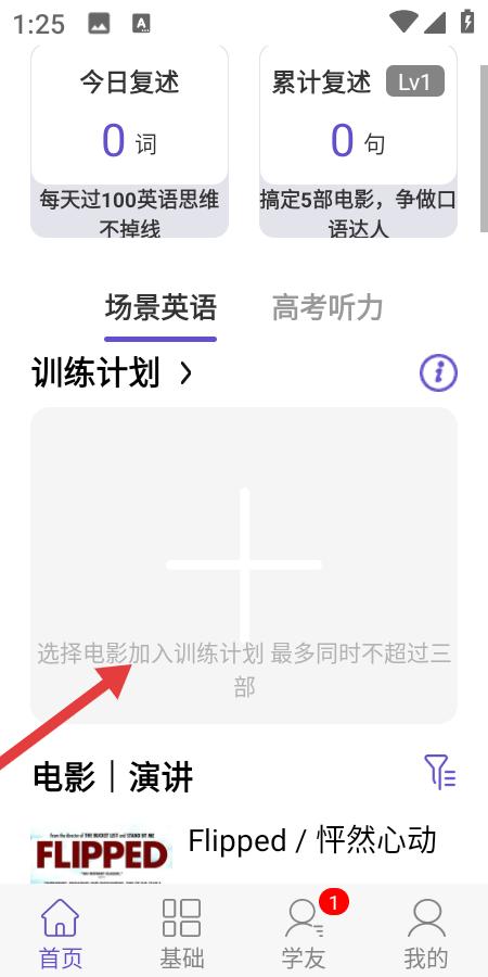 1、場景英語模塊清晰訓練計劃入口引導選擇電影,最多同時加入三部,下方電影列表陳列怦然心動等資源,幫助用戶通過影視沉浸學習英語。