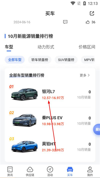 3、選車排序欄,點擊按月銷量高排序選項,讓車型按銷量排序展示,快速找銷量靠前車型,對比不同車銷量表現。