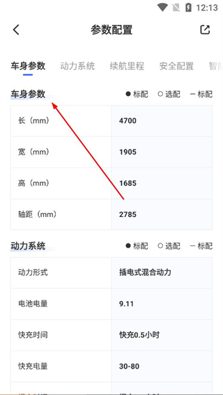 4、進入參數配置頁面切換車身參數動力系統等分類標簽,查看車身長寬高軸距等數據,以及動力形式電池電量快充時間等信息,完成車型參數的全面了解。