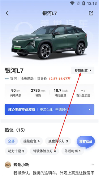2、在車型詳情頁,點擊參數配置選項,瀏覽車型的純電續航、軸距等基礎參數,還能查看核心零部件供應商信息。
