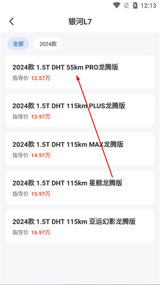 3、在車型詳情頁選擇具體款式,查看2024款不同版本的指導價格,根據自身預算,挑選對應價格區間的版本。