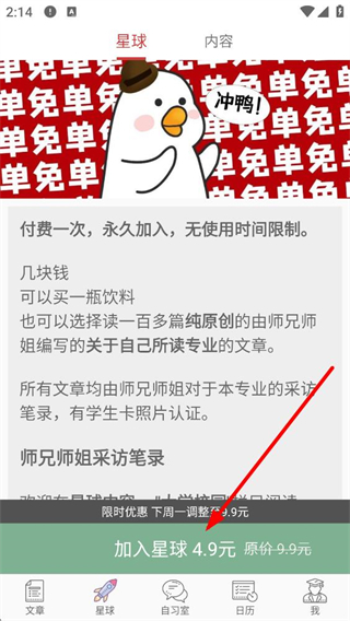 2、星球界面,顯示付費永久加入的說明,可獲取師兄師姐編寫的專業文章,這些文章經學生卡認證,當前限時優惠即可加入該板塊。