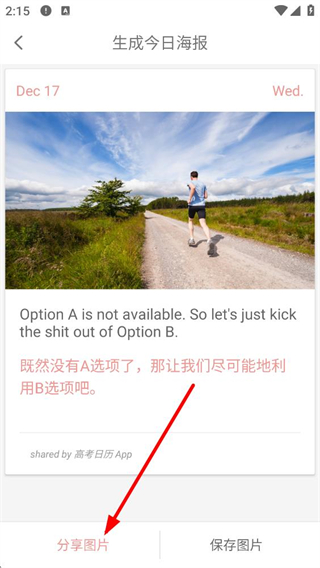 4、生成今日海報界面,可查看包含日期、勵志內容的海報樣式,支持分享圖片或保存圖片,方便將勵志內容分享給他人或留存使用。