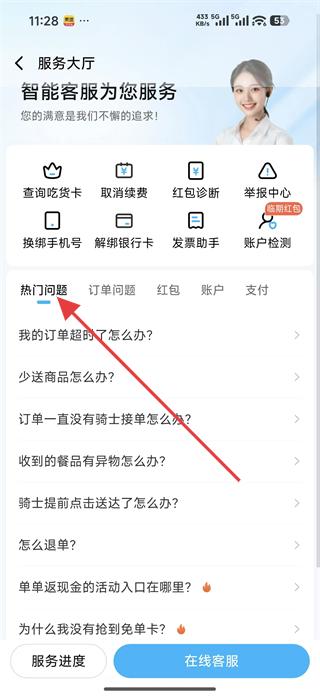 1、進入服務大廳可看到智能客服服務板塊,有查詢吃貨卡、取消續費等功能,點擊熱門問題,可查看訂單超時、少送商品等常見問題。