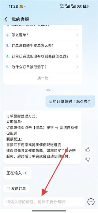 2、在我的客服頁面輸入問題如我的訂單超時了怎么辦,智能客服會給出訂單超時的處理方式,如立即催單、聯系配送等。