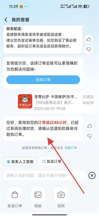 4、選擇訂單后客服會查詢訂單情況,若訂單超過系統處理時效,會提示確認具體問題和訂單,也可選擇聯系人工客服進一步處理。