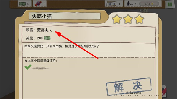 4、解決失蹤小貓案件,獲得獎勵和星級評價,提升偵探聲望,解鎖更多案件和游戲內容,繼續探案生涯。