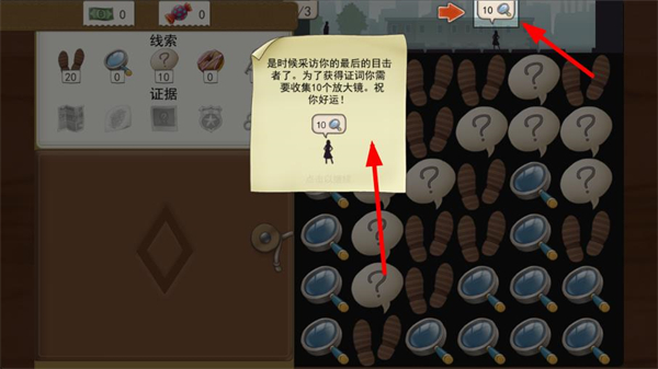 1、收集放大鏡道具,采訪最后目擊者,積累線索,為破解案件和完成調查任務提供關鍵信息。