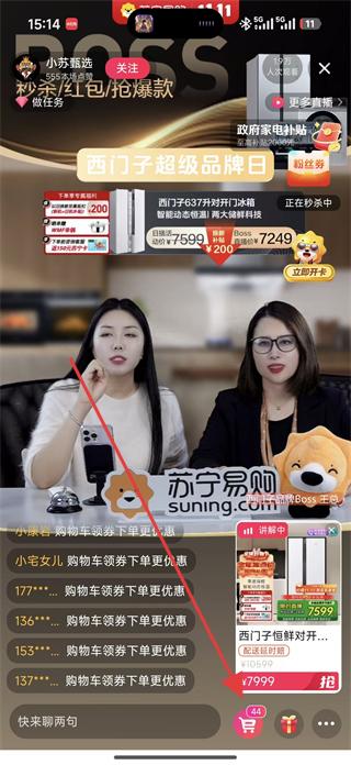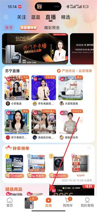 1、打開蘇寧易購app,進入直播頁面可看到正在直播的各類專場,選擇感興趣的直播點擊進入。