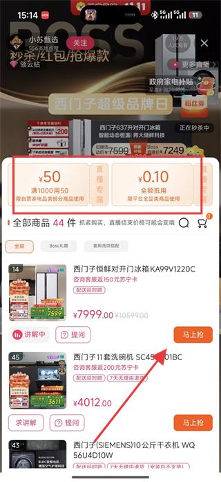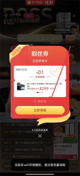 2、進入直播后若有粉絲券正在秒殺,可點擊立即領取,獲取優惠券以便后續購買商品時使用。