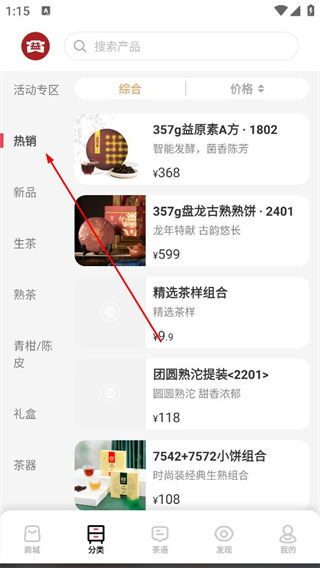 4、點擊分類板塊進入分類頁面,可查看熱銷、新品等分類,精選茶樣組合等商品,了解更多茶葉產品。