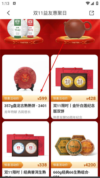 2、在雙11益友惠聚日頁面可查看大益傳奇1975熟茶、金針白蓮紀念版雙餅等商品,選擇心儀的商品點擊進入詳情頁。