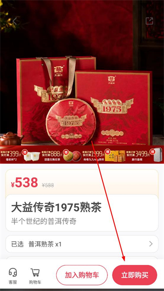 3、在商品詳情頁可查看大益傳奇1975熟茶的價格和介紹,點擊立即購買可進入下單頁面,購買該款茶葉。