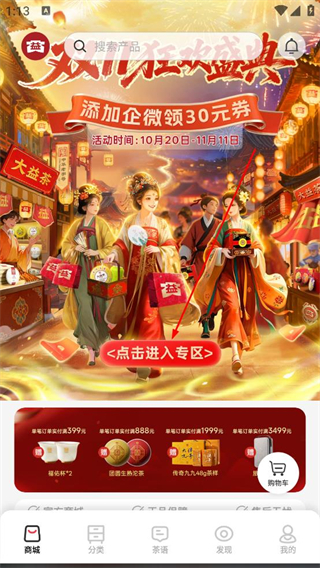 1、進入益友會app商城頁面,可查看雙11狂歡盛典活動,了解添加企微領30元券的活動信息,點擊進入專區可查看活動商品。