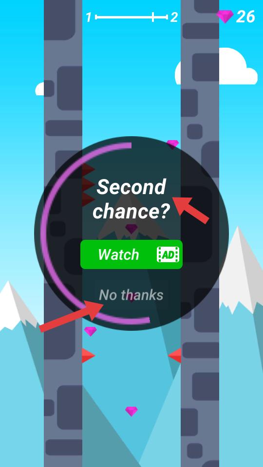 3、若游戲失敗,會出現Second chance的提示,可選擇看廣告獲得第二次機會,也能直接選No thanks。