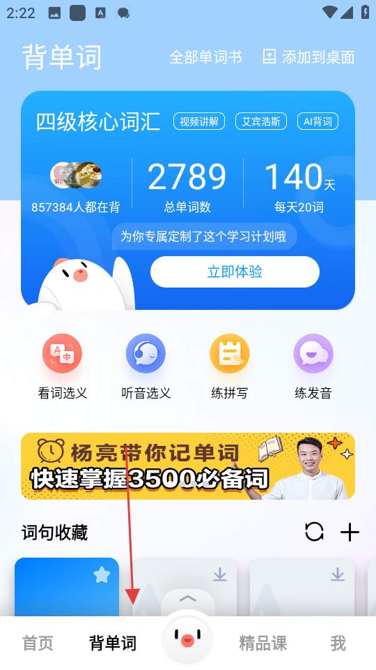 1、背單詞頁面,展示四級核心詞匯學習計劃總詞數2789、140天完,有看詞選義等功能入口,及課程推廣。
