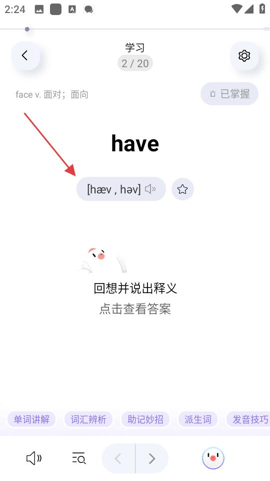 2、單詞學習界面,呈現單詞have,標注音標,可點擊喇叭聽發音,下方有回想并說出釋義提示。