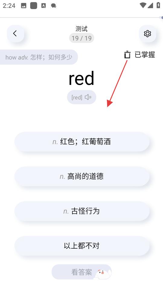 3、單詞測試界面,測試單詞red,給出四個釋義選項,右上角標已掌握,可作答或看答案。
